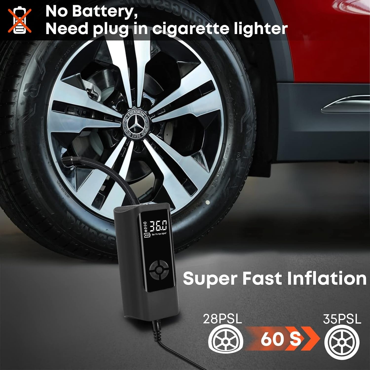 Presión máxima de 150 PSI con inflado ultra rápido: Rellena un neumático de bicicleta en menos de 30 segundos y un neumático de automóvil en menos de un minuto. Ideal para uso en carretera o en casa.