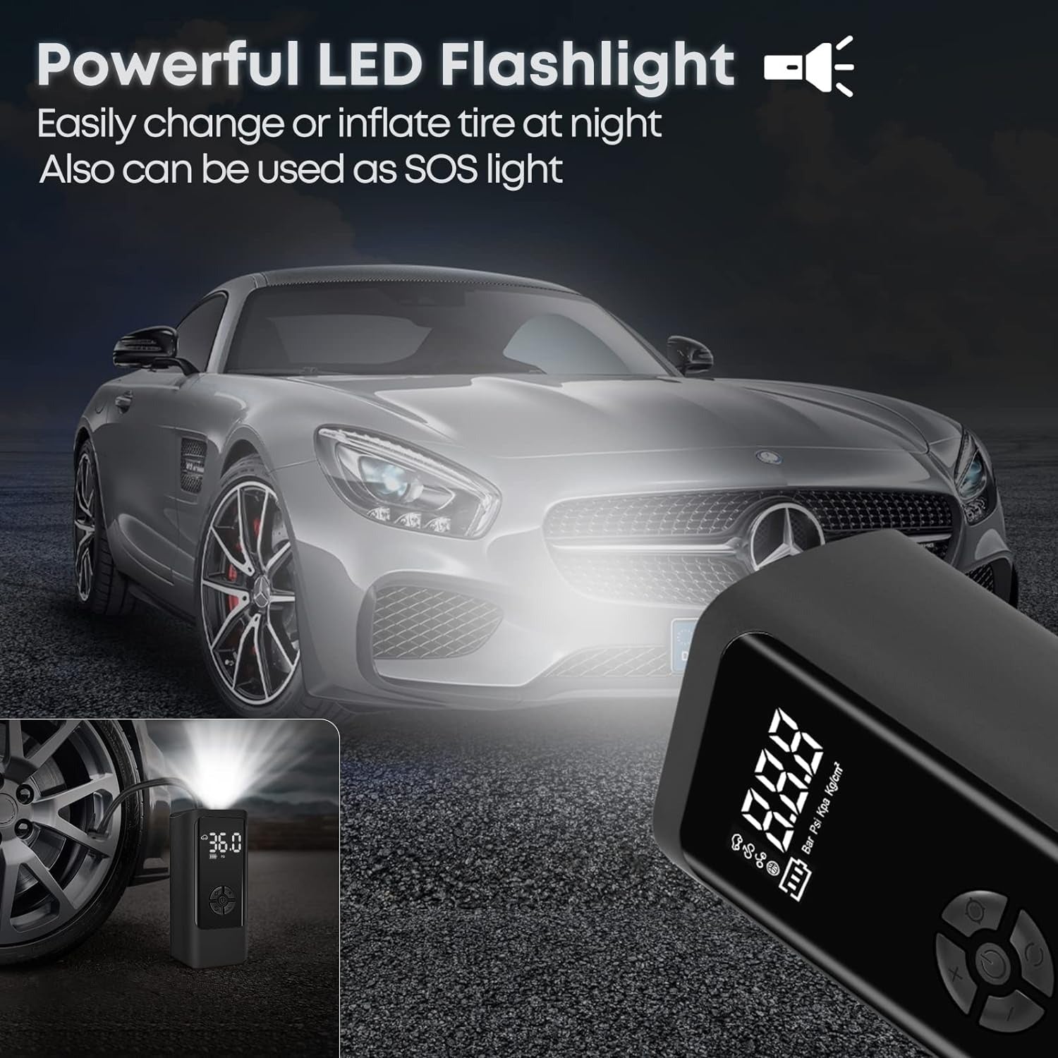 Linterna LED incorporada: Perfecta para situaciones nocturnas o de emergencia. Ilumina tu espacio mientras inflas o revisas tus neumáticos.